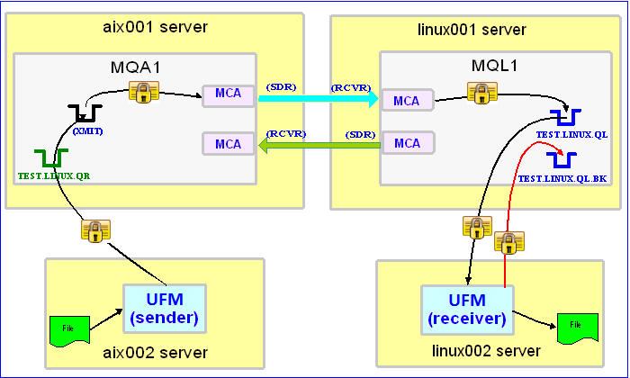 – MQL1 is a queue manager residing on a Linux (linux001) server (receiver)